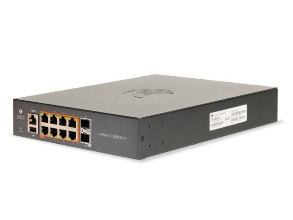 The Cambium Networks cnMatrix EX1010-P is an intelligent Ethernet PoE+ Switch with 8 1-Gbps and 2 1-Gbps SFP fiber ports that delivers full Layer 2 and Layer 3 capabilities with enhanced access security.