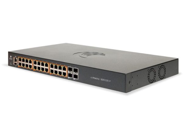 The Cambium Networks cnMatrix EX1028-P is an intelligent Ethernet PoE+ Switch with 24 1-Gbps and 4 1-Gbps SFP fiber ports that deliver full Layer 2 and Layer 3 capabilities with enhanced access security.