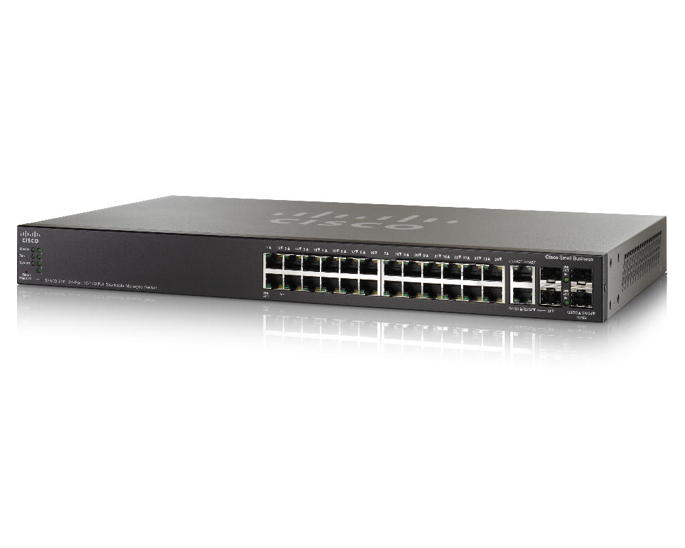 The Cisco SG500X-24 is a 24-port stackable managed Gigabit Ethernet switch, with 4 Enhanced Small Form-Factor Pluggable (SFP+) slots and optional 10 Gigabit Ethernet connectivity. It offers energy-efficient technology (EEE), true stacking, IPv6, and the advanced security and network features needed to support a growing business network. The switch is easy to manage and includes a limited lifetime warranty with next-business day advance replacement.
