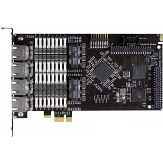 The Digium TE820 (1TE820F) is an 8 port T1/E1/J1 Digital telephony PCI Express card without hardware echo cancellation. It allows for software-selectable digital telephony interfaces between T1, E1, and J1.