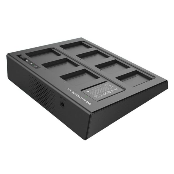 The Grandstream GMC08 Battery Charger works with the Grandstream WP820 Cordless IP Phone. It has 8 slots so that 8 batteries can be charged at the same time.