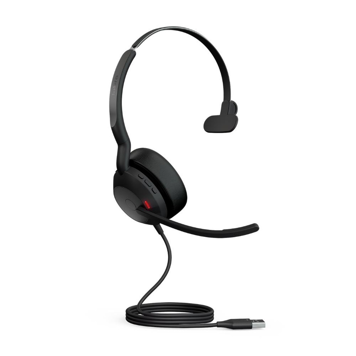 The Jabra Evolve2 50, Corded Headset, USB-A, UC Mono, Black is a corded professional headset with USB-A connectivity that is optimized for Unified Communications and comes with powerful mono Active Noise Cancellation (ANC), noise-cancelling mics, 28mm custom speakers, and game-changing Jabra AirComfort technology to help you stay focused and comfortable.