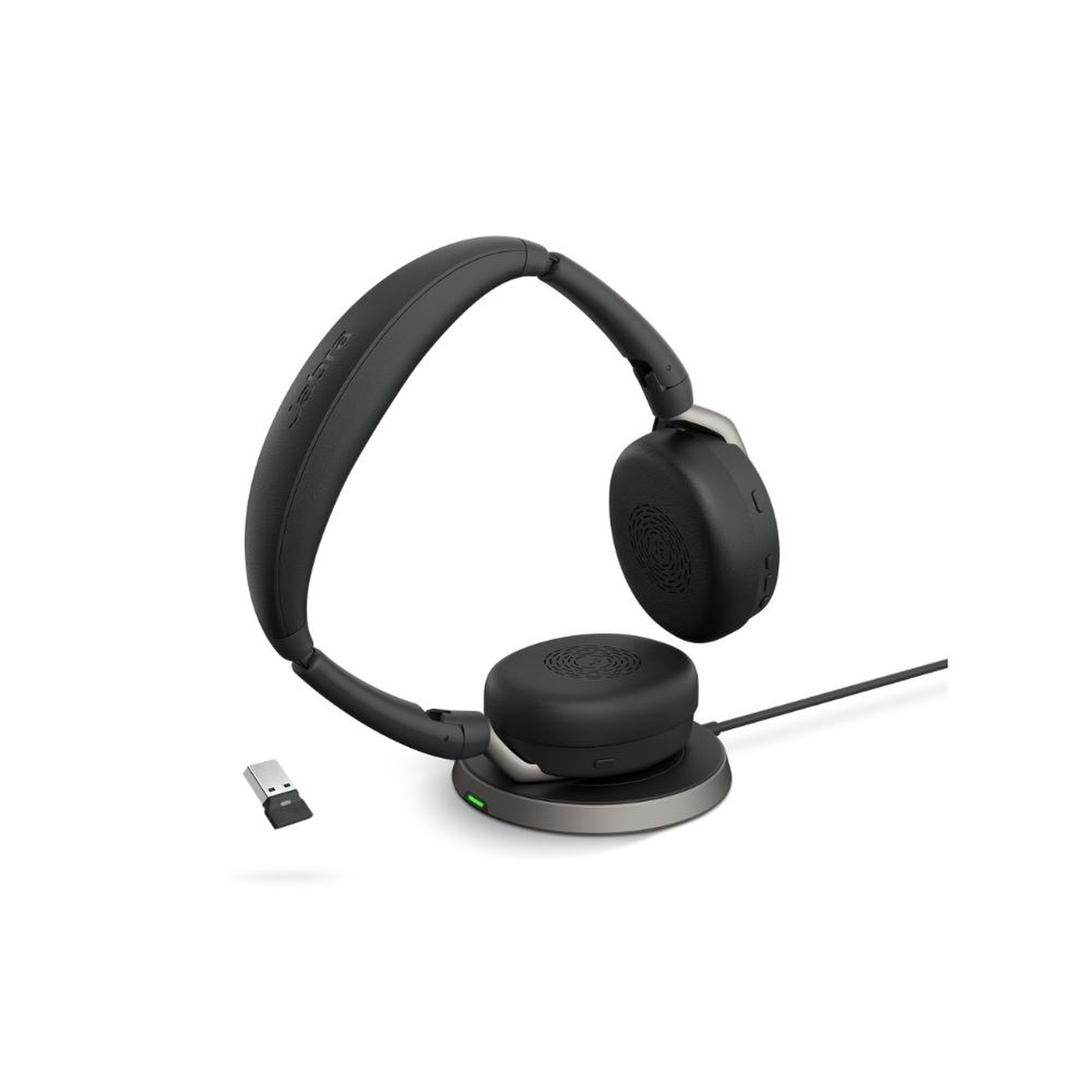 The Jabra Evolve2 65 Flex, Wireless Headset, Link380a MS Stereo With Wireless Charger Black, Microsoft Teams Certified is a wireless professional completely foldable headset that is optimized for Microsoft Teams, comes with a charger, a Link380a USB-A connector, and is equipped with the latest work-friendly features including best-in-class Hybrid Active Noise Cancellation (ANC), noise-cancelling microphones, and game-changing Jabra AirComfort technology to help you stay focused and comfortable anywhere.