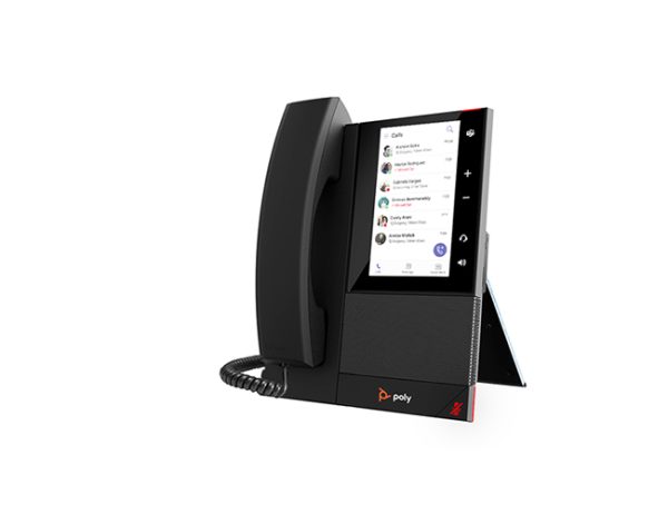 The Poly CCX 500 SIP Phone with handset is a Microsoft Teams and Skype certified device that features a 5 color touchscreen.