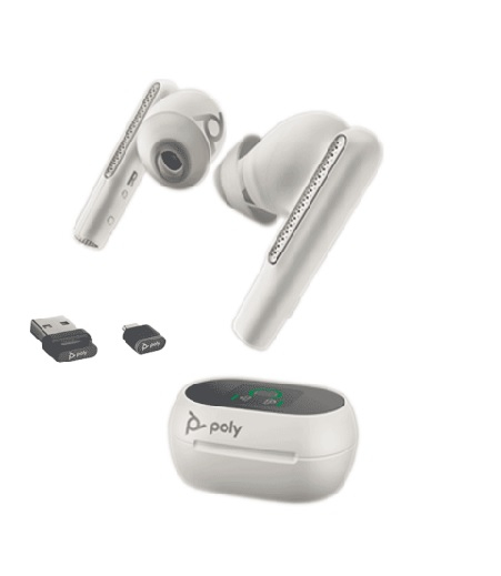 The Poly Voyager Free 60+ UC, USB-C Earbuds with Touchscreen Charge Case are Enterprise-grade true wireless earbuds with a USB-C connection that come in white, include a Touchscreen Charge Case, and have been specifically designed for office, home, and hybrid workers who want a comfortable all day wear and uninterrupted listening.