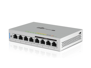 The US-8-60W is an 8-port gigabit switch with four 802.3af PoE ports. Its auto-sensing PoE ports deliver up to 15.4W of power per port.